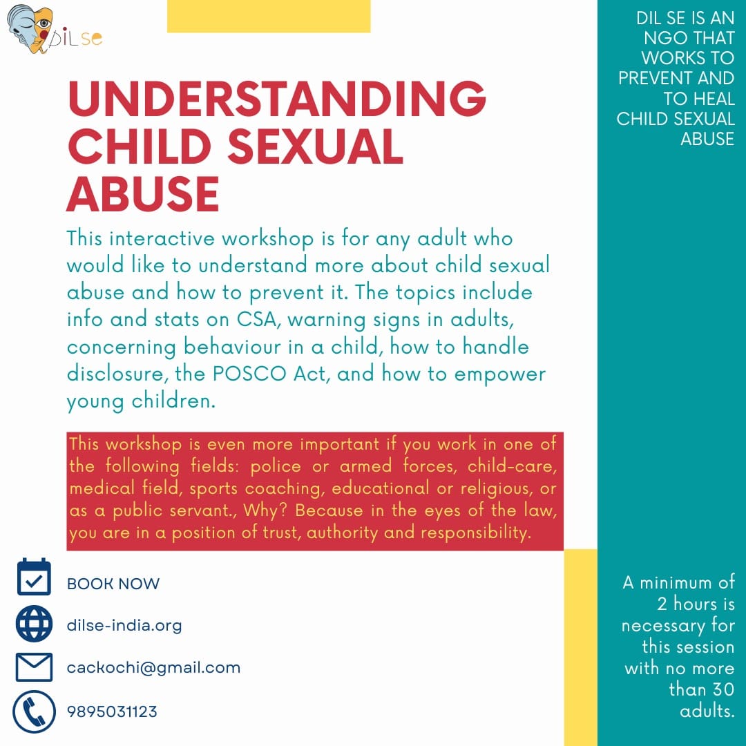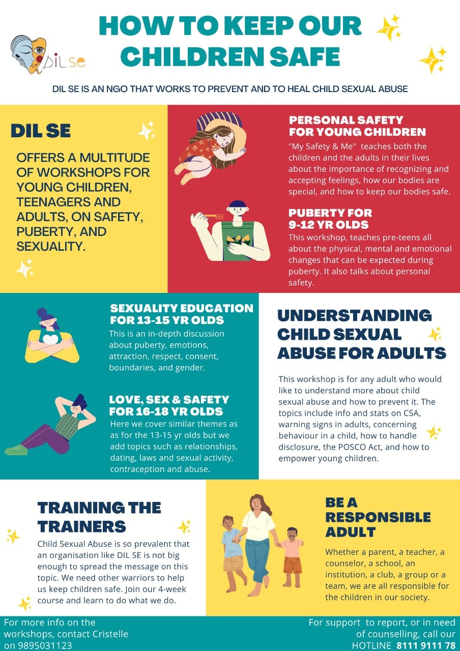 Over the years of working with children in different settings and from different socio-economic backgrounds, Dil Se came across multiple cases of child sexual abuse. It was a delicate topic that was not being addressed with ease. We took an interest as to why this was and started to understand the stigma and taboo this CSA held. Without too much ado, Dil Se decided to take up the challenge of helping rid the world of child sexual abuse.
