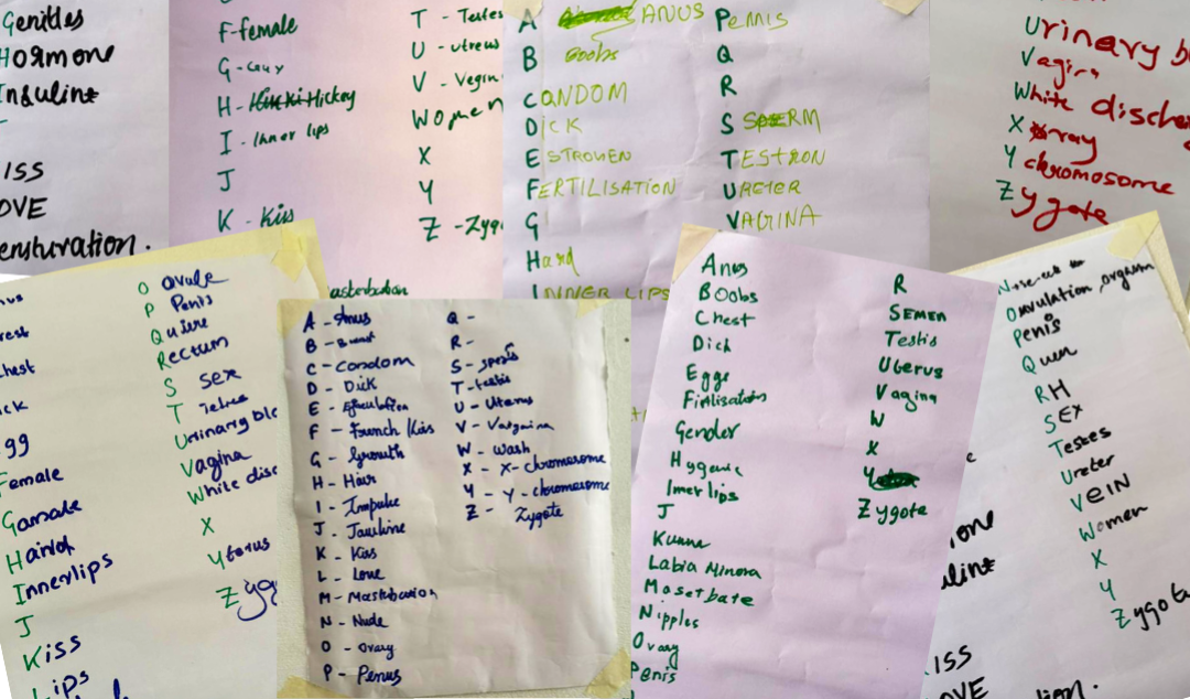 Our second activity was another team challenge. We wrote A-Z on chart paper and asked each team to write as many words as possible, one for each letter, related to the body, gender, sex, or relationships. Words could be in English or Malayalam, using formal terms or slang. The room filled with laughter as the kids embraced the freedom to express themselves without judgment.